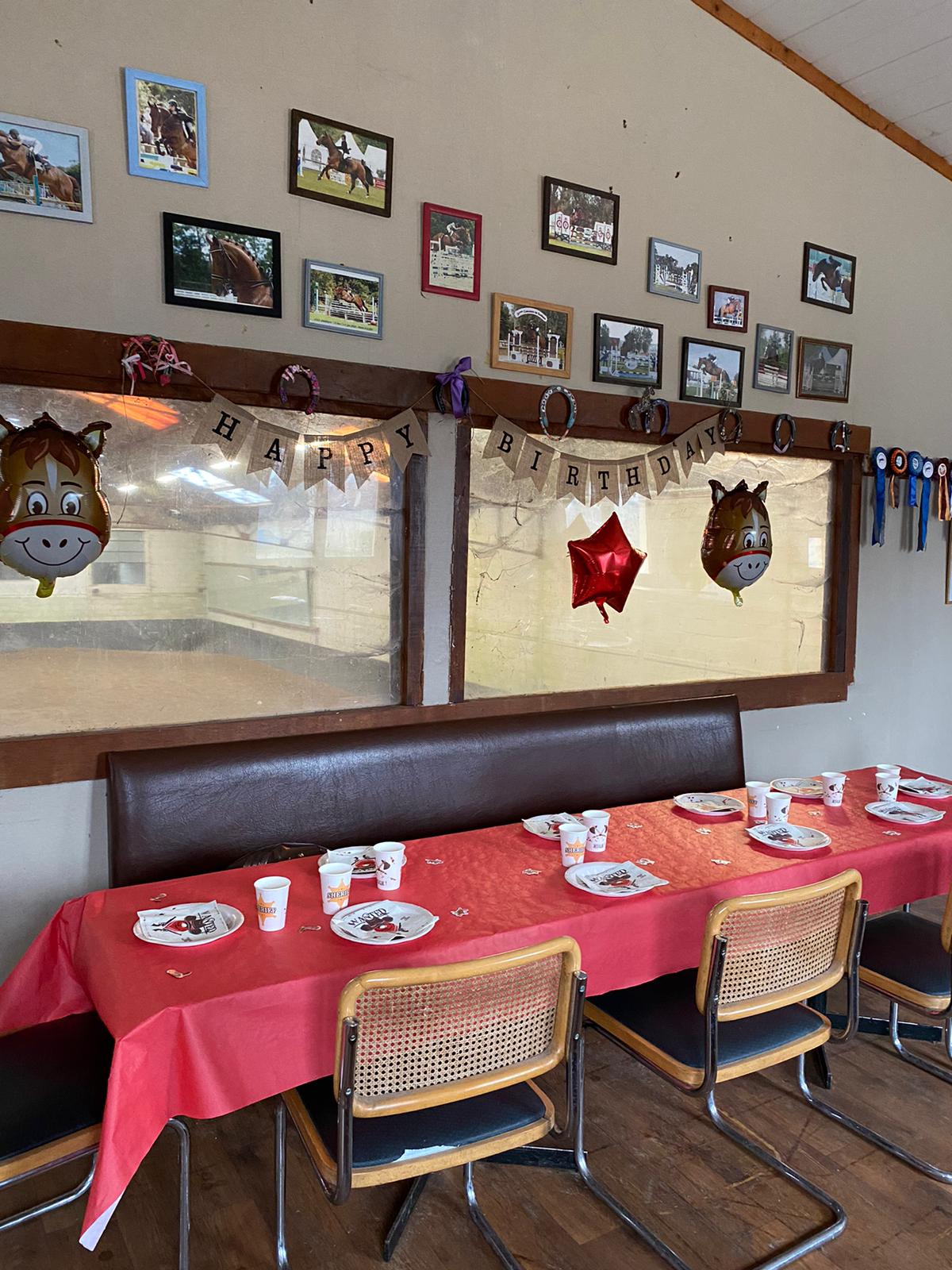 - 1h environ goûter, assiettes, verres et décorations apportés par vos soins dans notre grand club house que vous pouvez décorer pendant la séance à poney ! Un grand réfrigérateur est à votre disposition