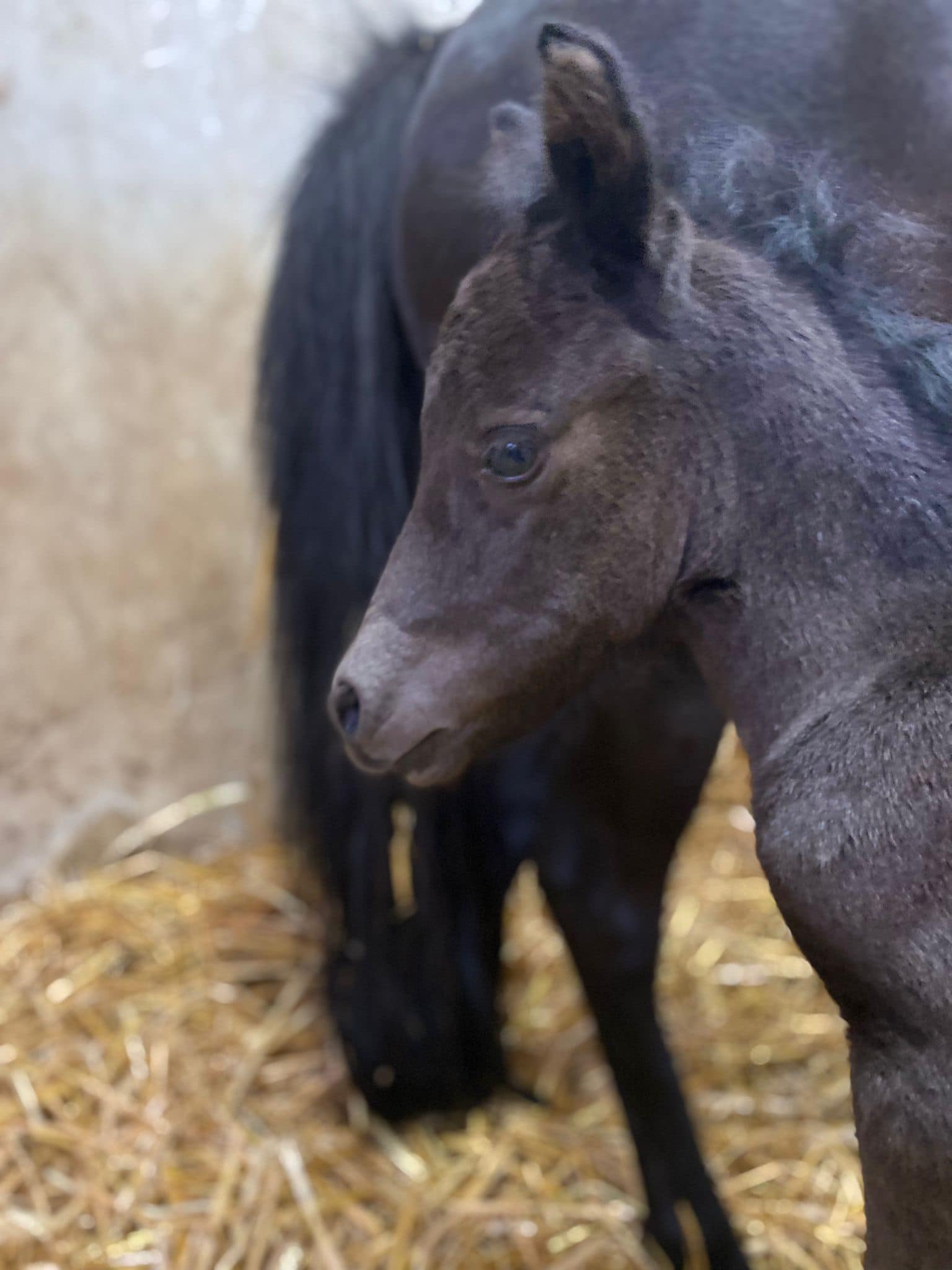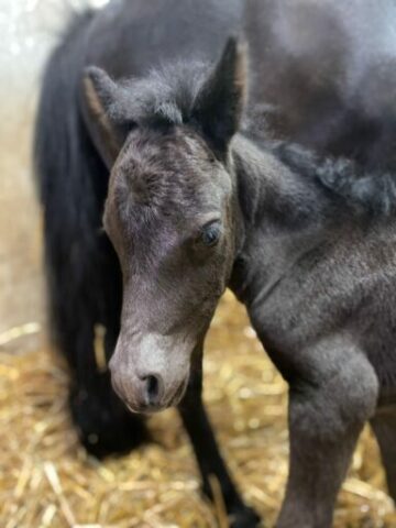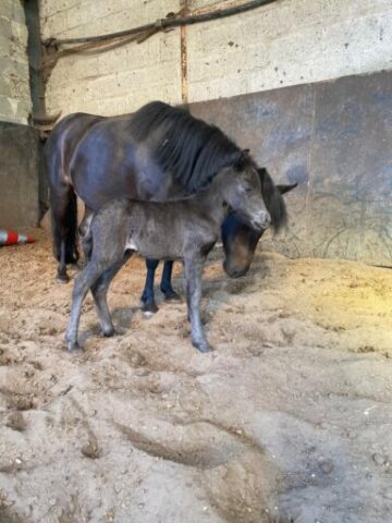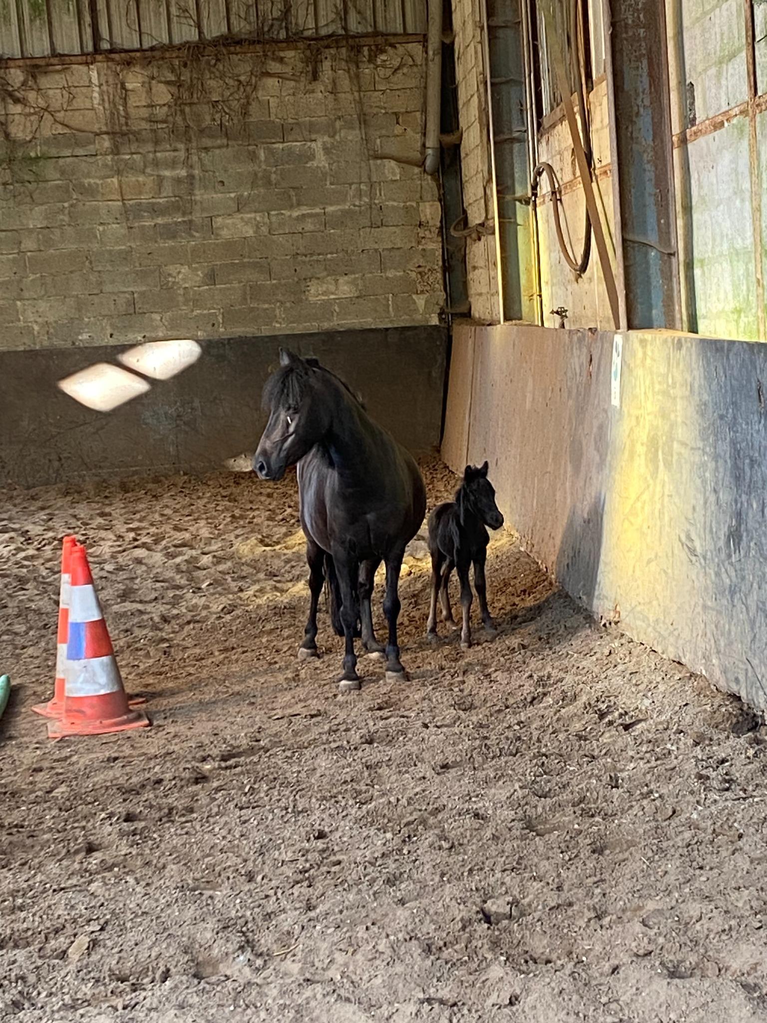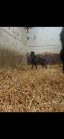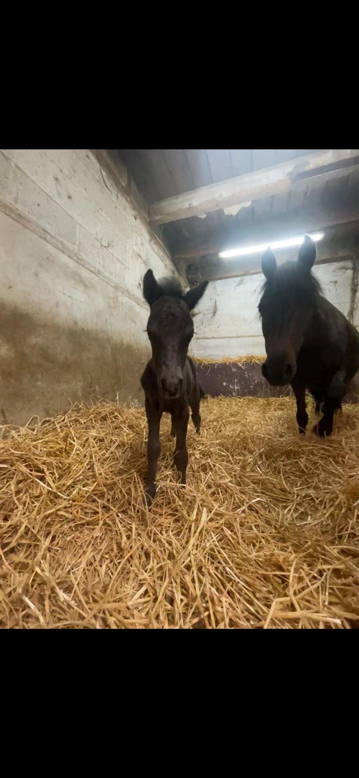 Le petit clown des écuries ! Né en 2024, il est tout noir comme sa maman. Sera petit B.